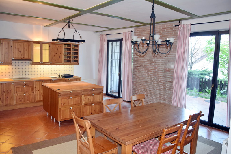 Az alsó szinten helyezkedik a kertkapcsolatos, teljesen gépesített konyha étkezővel.